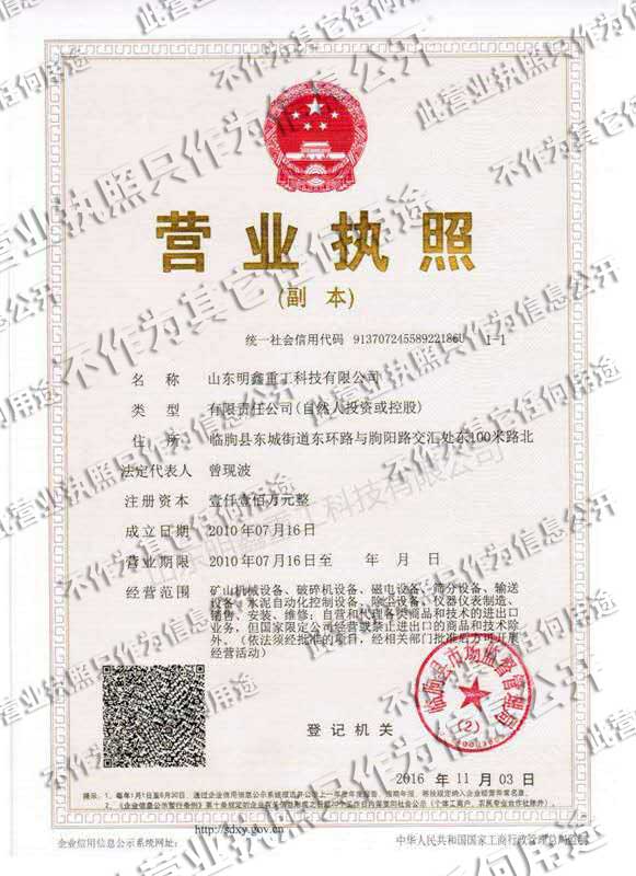 山東明鑫重工科技有限公司為是集科研開發,設計制造、銷售、安裝、調試為一體的技術制造企業。公司位于美麗的****風箏都-濰坊市(國家AAAA級森林公園-沂山景區駐地)臨朐東城工業園。本公司產品種類有:破碎機設備,(電磁、永磁)除鐵器設備,磁選機設備,篩分設備,輸送設備,給料機設備,水泥自動化控制設備、除塵設備,儀器儀表等產品。其產品有五十多個系列,四百多種規格,并可根據客戶需求設計生產相應的產品。其產品廣泛應用于冶金、電力、煤炭、礦山、造紙、食品、化工建材、耐火材料、磚瓦、水泥、玻璃等行業,產品暢銷國內三十多個省市、自治區。